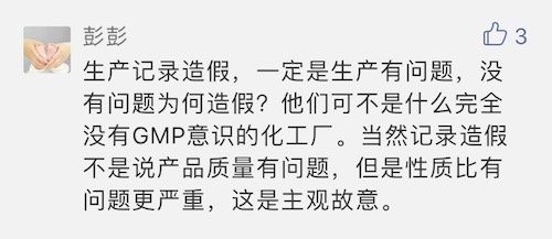 也有網友認為:“生產記錄造假一定是生產有問題,沒問題為什么造假?他們可不是沒有GMP意識的化工廠。當然記錄造假不是說產品質量有問題,但是性質比問題更嚴重,這是主觀故意。”
