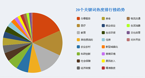 圍繞群眾關切,本次征集活動共設置了20類話題。辦事服務、醫(yī)療、教育是網(wǎng)友關注的重點,位居話題榜前三位。科研創(chuàng)新、農業(yè)農村、社會保障、養(yǎng)老、經(jīng)濟政策、生態(tài)環(huán)保、住房分列四到十位。