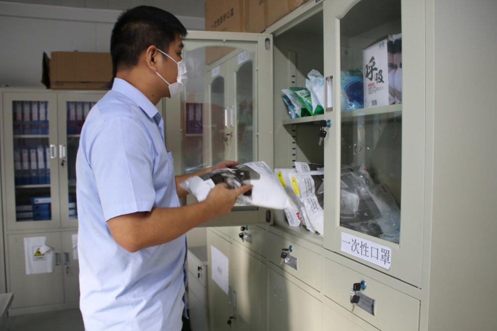圖為郭衛紅為員工發放防護用品前進行檢查