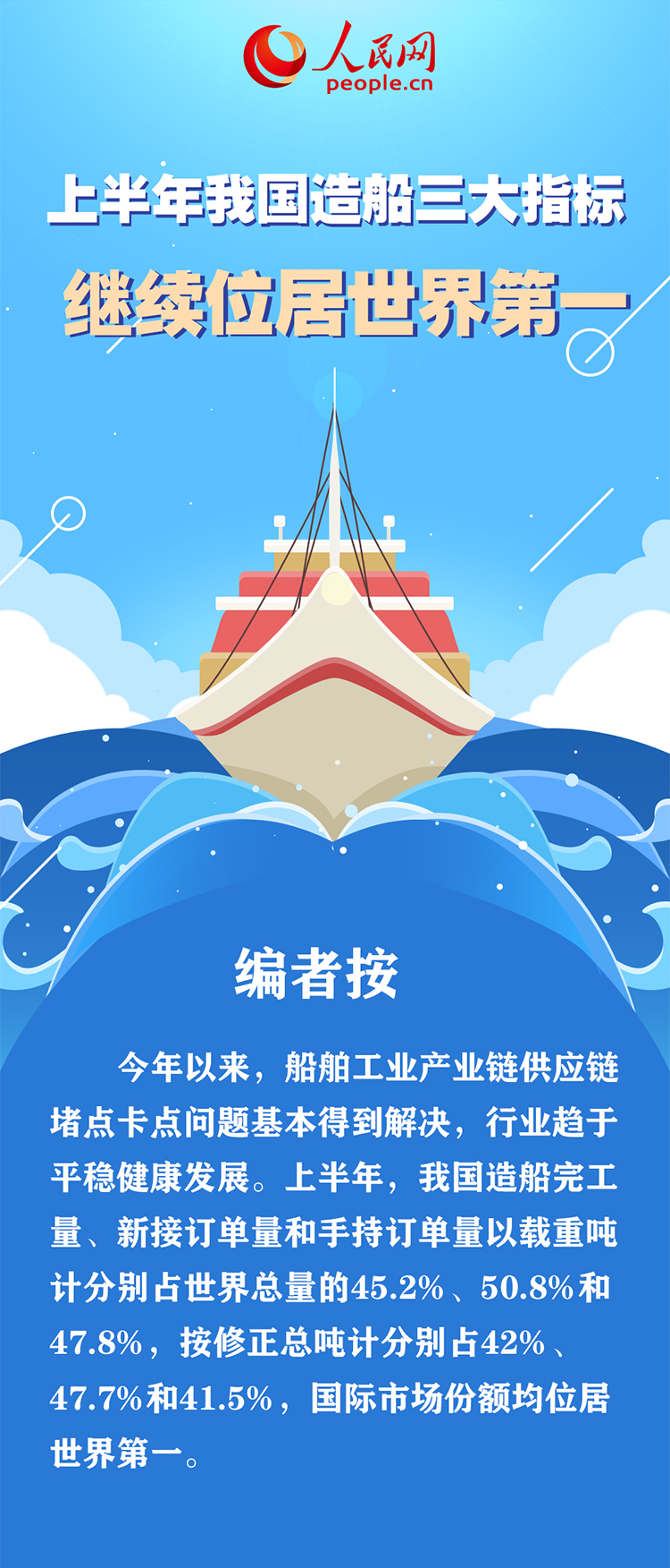 今年上半年,我國造船完工量、新接訂單量、手持訂單量三大指標在國際市場的份額繼續位居世界第一。分別占世界總量的45.2%、50.8%和47.8%,按修正總噸計分別占42.0%、47.7%和41.5%。