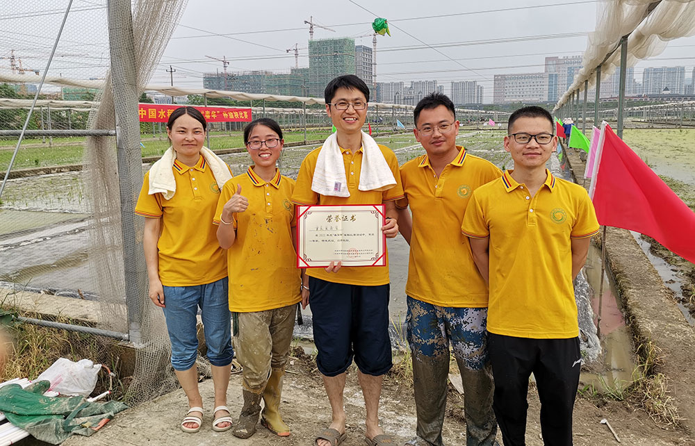 王克劍(中)帶隊參加中國水稻研究所組織的插秧比賽。受訪者供圖